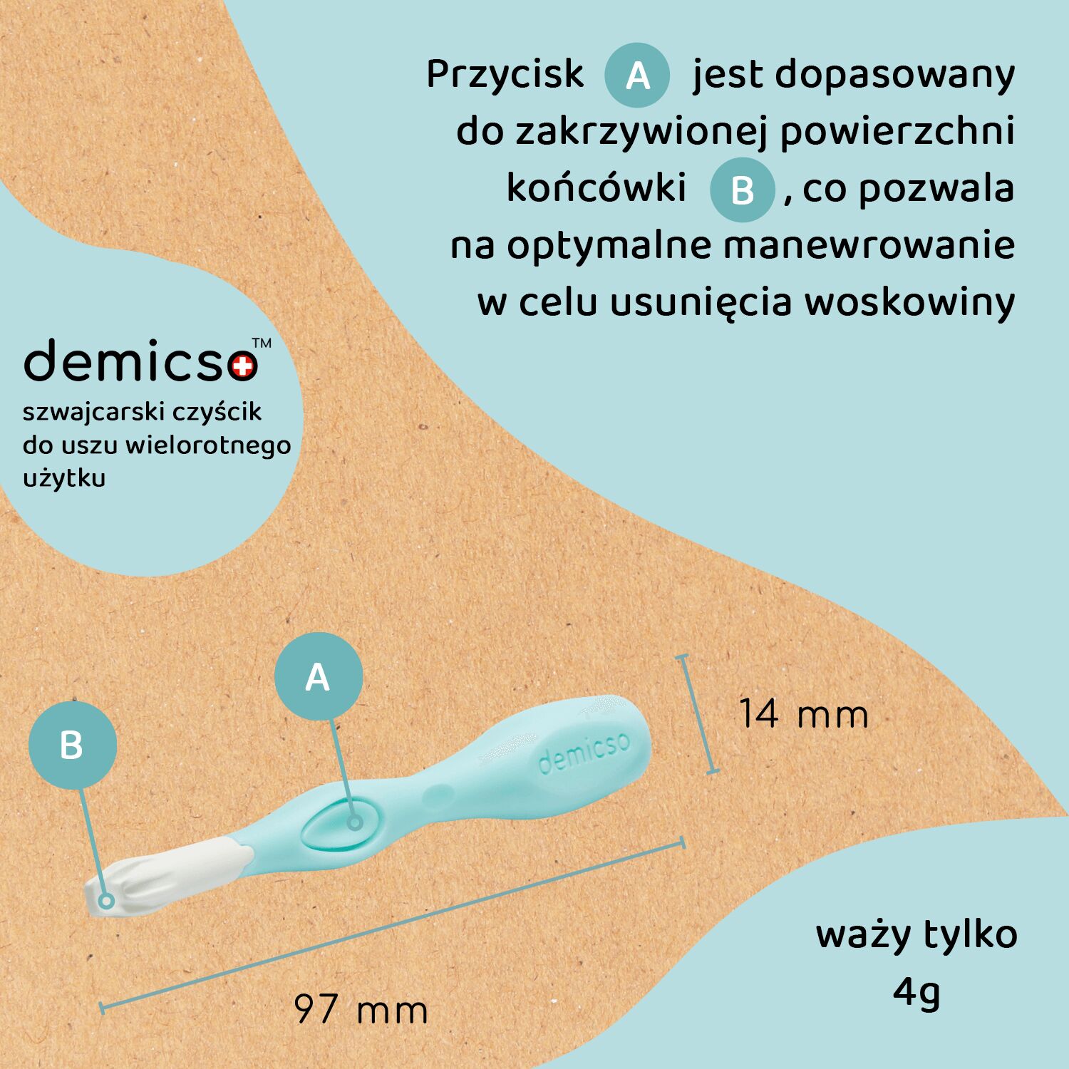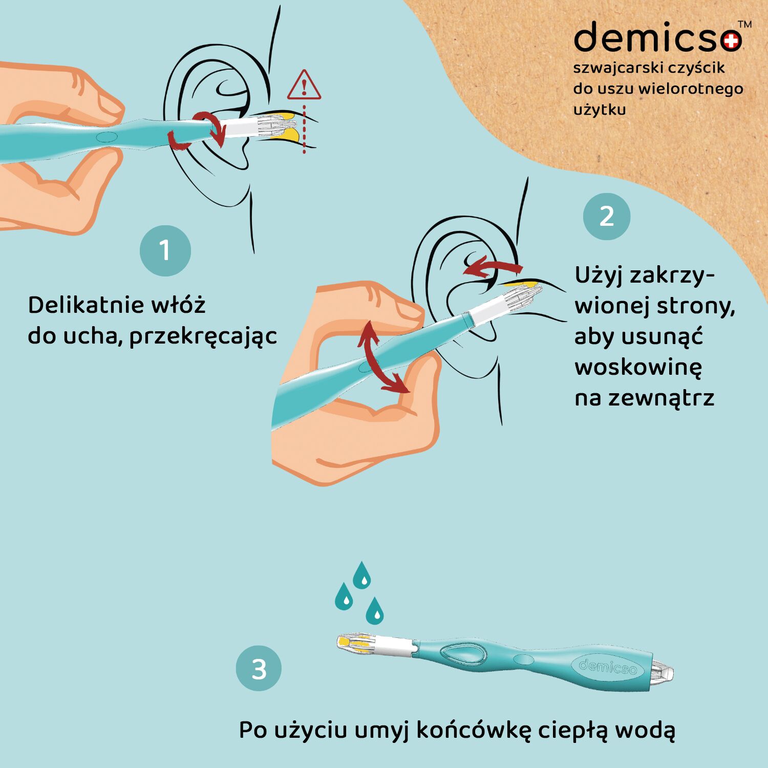 Wielorazowy szwajcarski czyścik do uszu DEMICSO to innowacyjne i ekologiczne rozwiązanie, które pozwala zadbać o higienę uszu w sposób bezpieczny i przyjazny dla środowiska. Wykonany z wysokiej jakości materiałów, gwarantuje trwałość i komfort użytkowania. Dzięki swojej unikalnej konstrukcji, czyścik DEMICSO skutecznie usuwa nadmiar woskowiny, eliminując potrzebę stosowania jednorazowych patyczków higienicznych. To idealny wybór dla osób ceniących wygodę, oszczędność oraz troskę o planetę. Wybierz wielorazowy czyścik do uszu DEMICSO i zadbaj o zdrowie swoich uszu, jednocześnie ograniczając ilość odpadów!